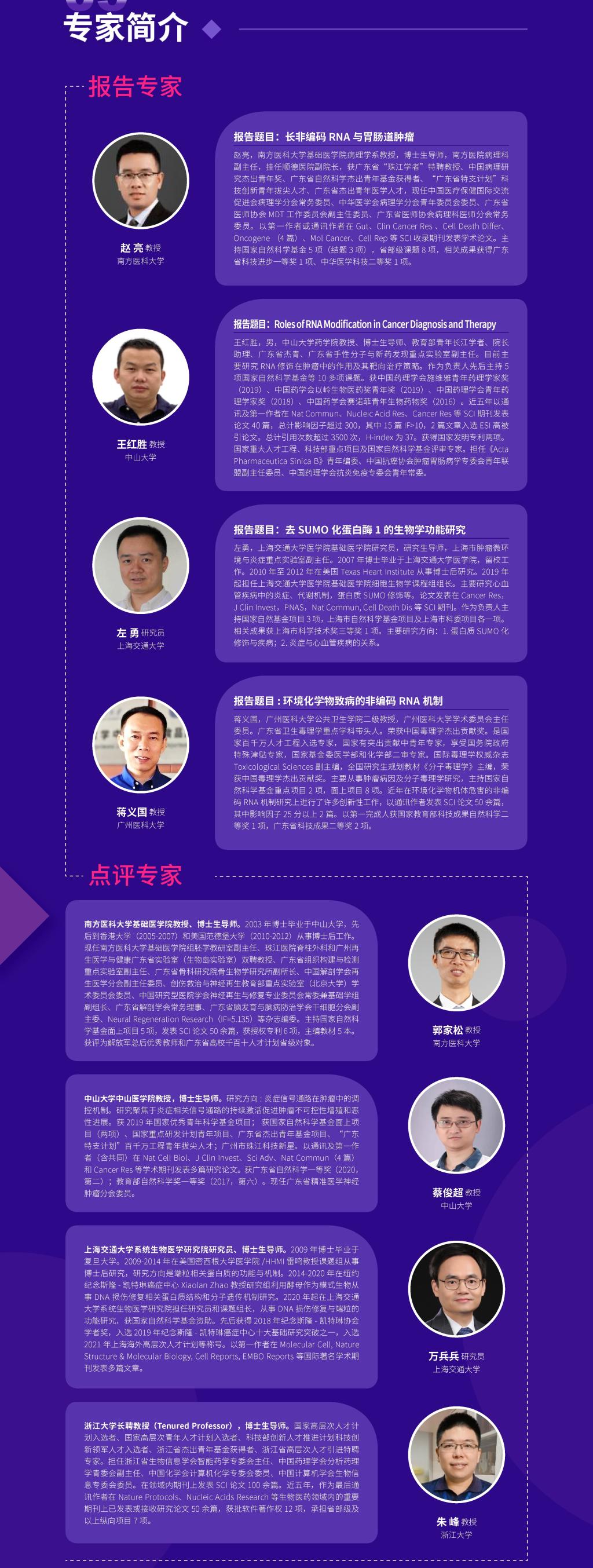 由新葡萄8883官网举办的2021年广东省研究生论坛——非编码RNA与人类疾病分论坛拟于10月16日召开。论坛组委会邀请了广州医科大学蒋义国教授,南方医科大学赵亮教授、郭家松教授,中山大学王红胜教授、蔡俊超教授,上海交通大学左勇研究员、万兵兵研究员,浙江大学朱峰教授等八名国内相关领域知名学者做学术报告,并对研究生汇报进行点评、评优。本论坛旨在为研究生提供一个展示创新成果和交流学习的平台,诚邀各位老师和同学参与和线上观看!