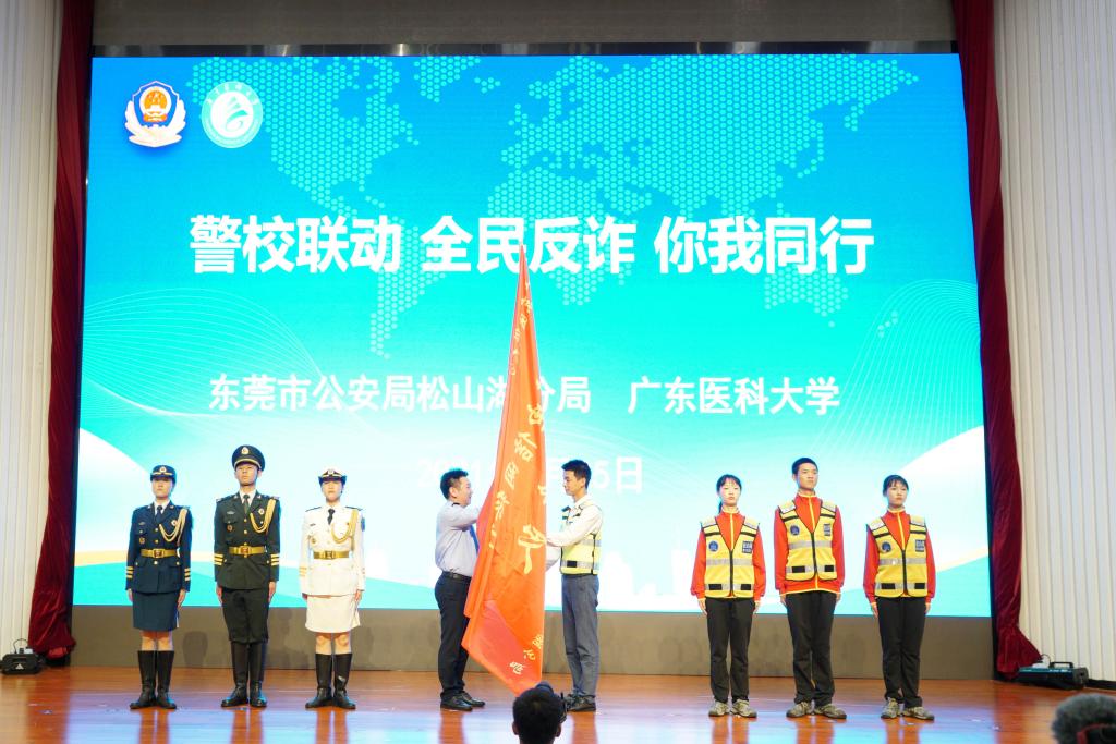 韩志江代表松山湖公安分局向新葡萄“反诈骗先锋队”授旗。