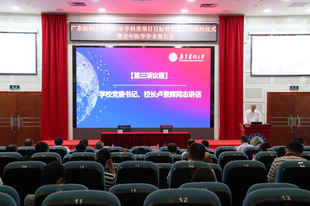 4月28日,学校2021年学科类项目目标管理责任书签约仪式暨老年医学学术报告会在东莞校区行政楼学术报告厅和湛江校区第二会议室通过双向视频召开。党委书记、校长卢景辉等学校党政领导,中国老年医学学会专家委员会主任委员、解放军总医院老年医学研究所何耀教授,学校各相关部门、学院和附属医院负责人,学科类二级项目、子课题负责人及项目核心成员等有关人员出席会议。会议由学校党委常委、副校长邝卫红主持。