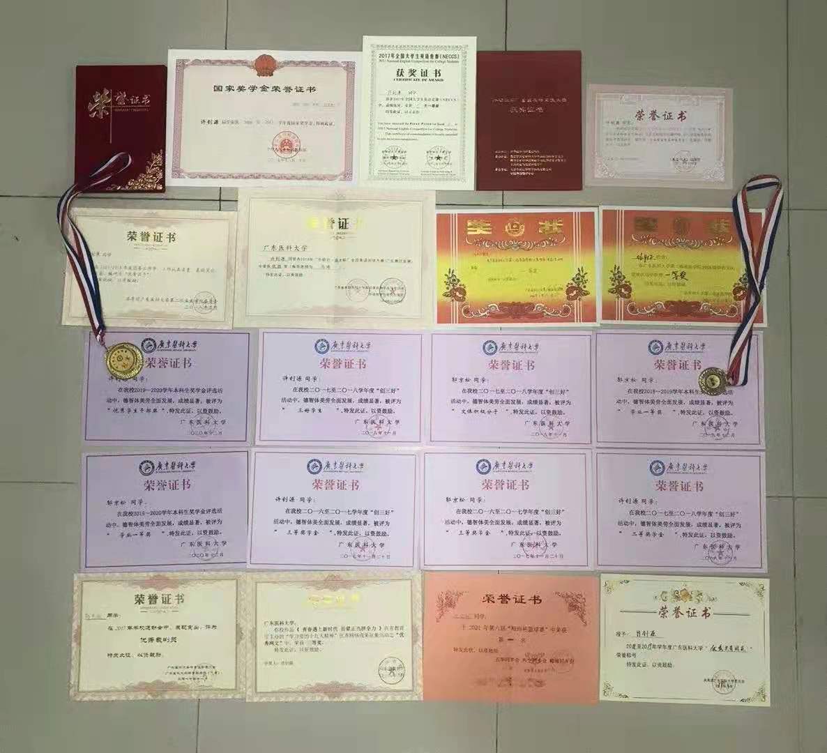 不管是学习还是参加比赛,或者是参加集体活动,他们都是一个团队,在相互支持与鼓励下,朝着“顶峰”前进。他们把集体荣誉当成重要的个人荣誉,宿舍获得过学校“年级宿舍文化建设活动一等奖”“第二临床医学院宿舍评选大赛一等奖” ,他们一起参加《广东省教育厅“我的中国梦”——“立志•修身•博学•报国”主题系列活动》获三等奖。他们还把每个人的荣誉都当成是集体荣誉,他们获得“国家奖学金”1人次,“全国大学生英语竞赛一等奖”2人次,“外研社杯”全国英语阅读大赛(广东赛区)优胜奖1人次,获校级一等奖学金2人次、二等奖学金1人次,三等奖学金2人次、三好学生2人次、优秀共青团员2人次、优秀学生干部3人次等累计三十余项奖项,荣誉证书连起来可从宿舍门口连到阳台。