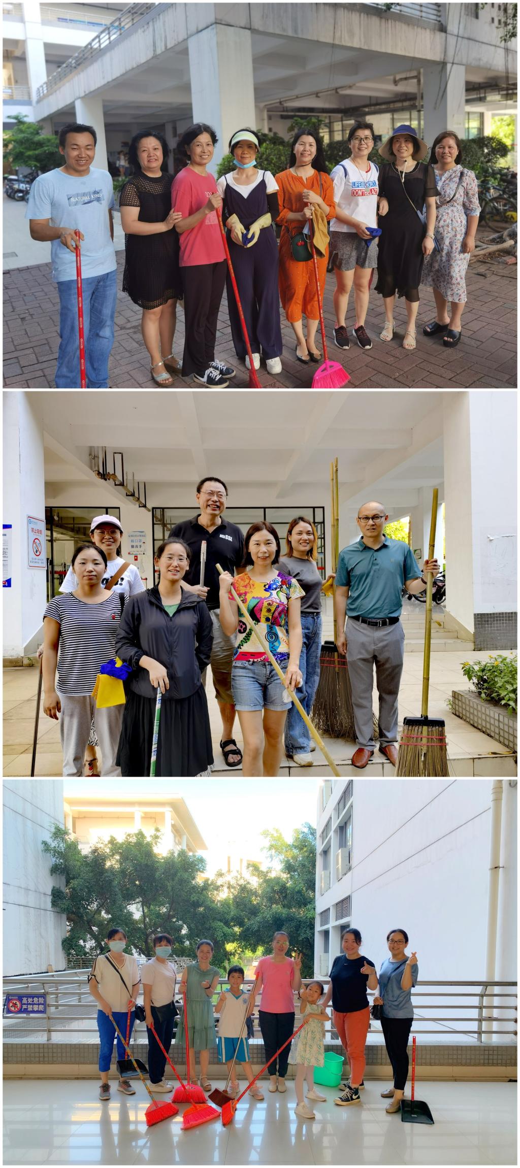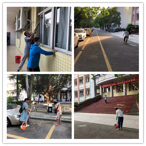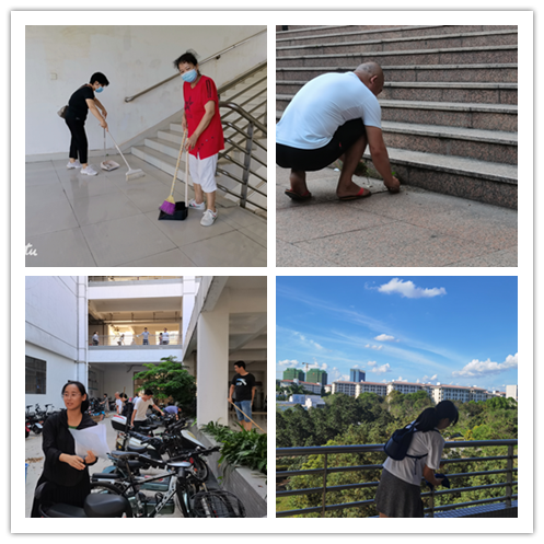 下午4:30分,报名的教职工纷纷到达指定地点集合。首先,校工会杨海云常务副主席对参加活动的教职员工表达了感谢;接着,科研平台服务管理中心工会分会林鸿程主席和黄连芳副主席对教学楼公共区域进行细致分工。清洁任务刚一下发,教职工便争先恐后得拿起扫把、拖把和抹布等工具前往指定区域。他们有的擦拭栏杆,有的打扫台阶,有的拔除杂草,有的清理卫生死角,干得不亦乐乎。甚至有教职工的子女也参与到此次集体活动,瞧他们小小的身影,干得有模有样。