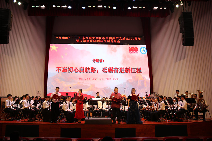 由校友吴先宏、王建军、杨卫、康艺林共同朗诵的《不忘初心启航路、砥砺奋进新征程》向广大师生展示了广东医波澜壮阔的63年征程路,一副副一帧帧不能忘却的画卷,引领着我们前行。
