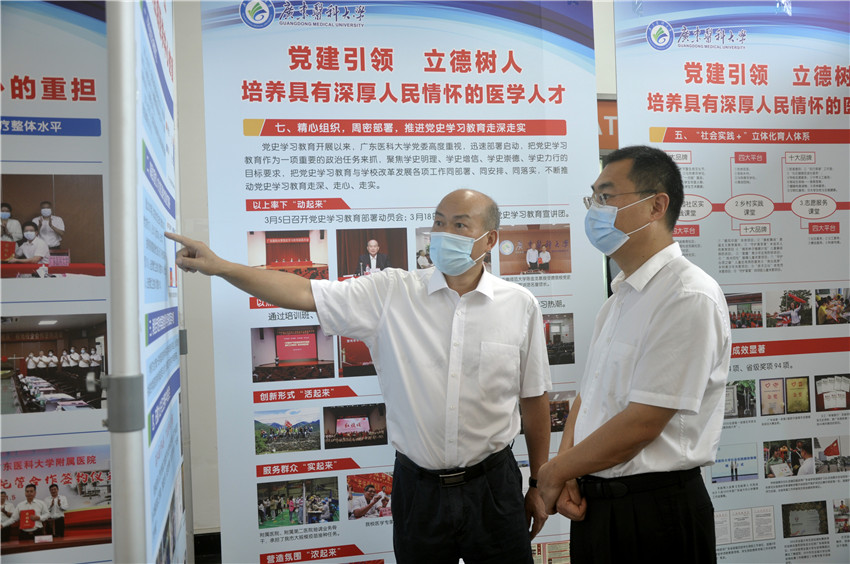 在湛江校区综合大楼一楼展厅,学校党委书记、校长卢景辉对学校基本情况、党建工作、医疗健康服务工作、科学研究、毕业生湛江就业情况、医院建设情况、新校区筹建情况、校地共建项目等向刘红兵书记一行作了详细汇报。刘红兵书记在聆听汇报过程中对学校工作表示赞同。