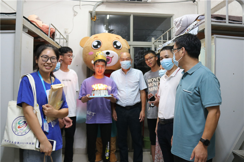 迎新暖心还有小“惊喜”。得知本科新生中有7名同学出生于9月5日,学校和学院领导齐出马,带上生日蛋糕、带上祝福到宿舍跟新生一起过生日。学校党委书记、校长卢景辉送完蛋糕之余,和新生们唠起家常:“都是从哪个地方过来的?”“到了学校就是一家人。” 卢景辉还告诉新生,学校每一届都有很多“学霸宿舍”,他们分别在学习、科研、创新创业等方面取得了很好的成绩,卢景辉勉励新生,树立好学习目标,不负时光、不负韶华,在广东医成就更好的自己。