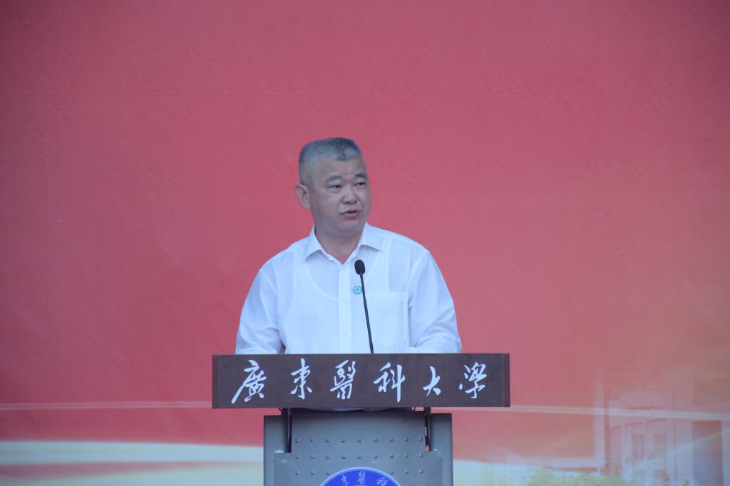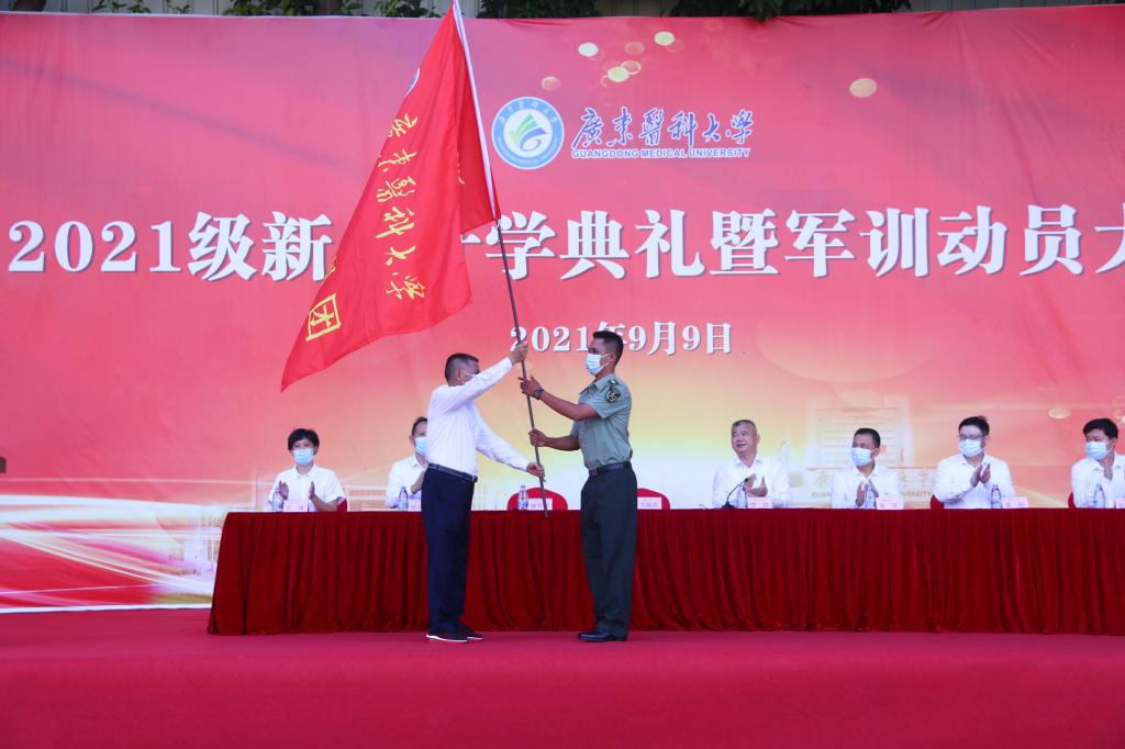 开学典礼上,新葡萄8883官网湛江校区军训团、新葡萄8883官网东莞校区军训团成立,湛江校区学校党委副书记、纪委书记、广东省监委驻新葡萄8883官网监察专员向献兵,授予湛江校区军训团团旗,湛江校区军训团团长唐芳奎接旗。东莞校区学校党委常委、副校长曾志嵘授予东莞校区军训团团旗,东莞校区军训团团长赖桂彬接旗。
