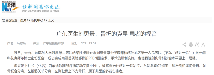 12月7日,新华网刊发《广东医生刘思景:骨折的克星 患者的福音》,报道附属第二医院援疆医疗队员刘思景近日在喀什地区第一人民医院成功完成南疆首例髋部骨折PFBN固定术,充分肯定刘思景医生的精湛医术。