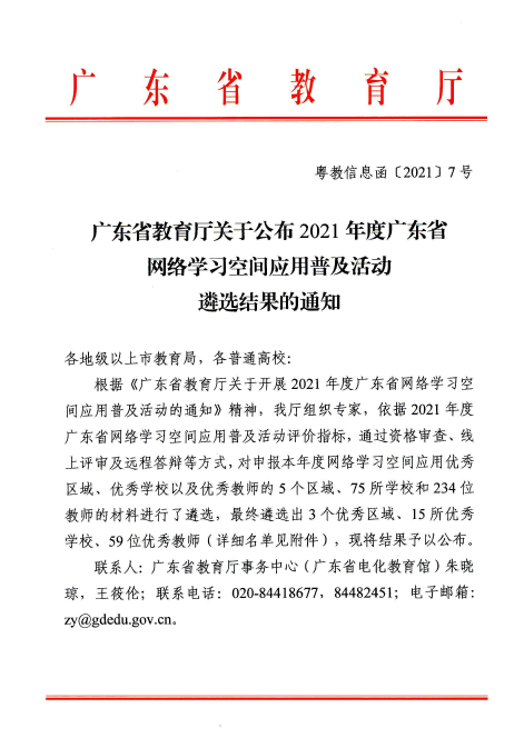 为全面提升师生信息素养,有效推进我省网络学习空间建设,促进空间应用与教育教学的融合创新,规范有序地推动“网络学习空间人人通”发展,广东省教育厅于今年7月举办了2021年度广东省网络学习空间应用普及活动。根据省厅的要求,新葡萄教务处和教育技术与信息中心精心组织,广泛宣传,发动教师们积极参与活动。经个人申报、组织专家评审,推荐了3位教师代表学校参加该活动。经过广东省教育厅评选,新葡萄米娜老师获得优秀教师奖。