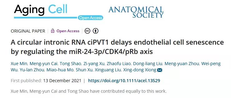 12月13日,新葡萄衰老研究所熊兴东教授以新葡萄8883官网为唯一通讯单位,在衰老研究领域国际顶级期刊Aging Cell(中科院一区,Top期刊,IF 9.304)上发表了最新研究成果“A circular intronic RNA ciPVT1 delays endothelial cell senescence by regulating the miR-24-3p/CDK4/pRb axis”,该研究首次揭示了一个内含子来源的环状RNA ciPVT1在血管内皮细胞衰老中的作用机制。