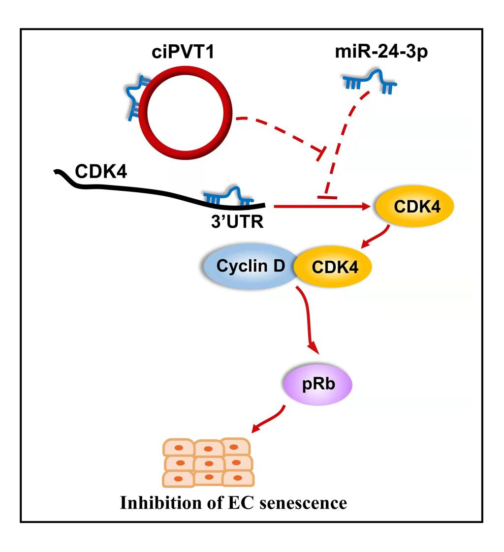 血管内皮细胞排列在血管内表面,形成具有多种功能的保护性屏障。血管内皮细胞衰老会引起内膜功能障碍,而内膜功能障碍是动脉粥样硬化和冠心病的独立危险因素。因此,研究血管内皮细胞衰老机制并探索延缓血管衰老的新方法,对动脉粥样硬化等心血管疾病的防治具有重要意义。环状RNA是一类是由RNA前体反向剪接产生的内源性RNA分子,已被证实参与多种生理病理过程,但它们在血管衰老中的功能仍然未知。在这项研究中,该团队发现了一个新的内含子来源的环状RNA—ciPVT1,其在衰老血管内皮细胞中的表达显著下调。研究结果显示,在年轻的血管内皮细胞中沉默ciPVT1可以促进细胞衰老,抑制细胞增殖,并导致体内外血管生成障碍;过表达ciPVT1则表现出相反的表型。机制研究结果表明,ciPVT1可以通过吸附miR-24-3p上调CDK4的表达,从而促进Rb的磷酸化并发挥延缓细胞衰老的作用。因此,ciPVT1可能成为预防血管内皮细胞衰老及其相关血管并发症的潜在靶点。该文是熊兴东教授今年内继在Molecular Therapy-Nucleic Acids发表血管衰老相关研究论文之后又一最新研究成果。Aging Cell是一本同行评审的国际开放获取期刊,旨在发表最高质量的创新研究,以解决衰老生物学中的基本问题,是老年医学研究领域最权威的期刊之一。