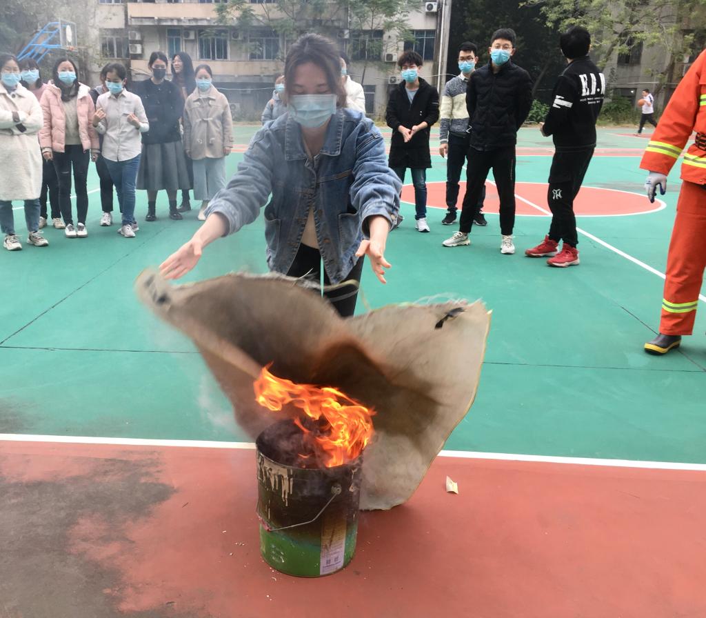演练前,安保处陈晓光同志强调消防工作的重要性和此次应急逃生、消防知识和灭火技能培训演练意义。接着安保处许良金老师向同学们讲授地震和火灾逃生知识、学生宿舍和实验室火灾危险性和防火措施,对如何使用室内消火栓、灭火器、灭火毯三种灭火器材扑灭初起火灾,如何正确佩戴防毒面具火场逃生,进行现场讲解,苏峰老师协助示范动作。只见同学们按照动作要领,镇定自若,利用灭火器和灭火毯快速、有序、准确、稳妥地处置初起火灾。人手一次,人人过关。最后许良金老师作了点评和小结,充分肯定演练成功的同时,对个别同学不正确的动作要领进行现场纠正。