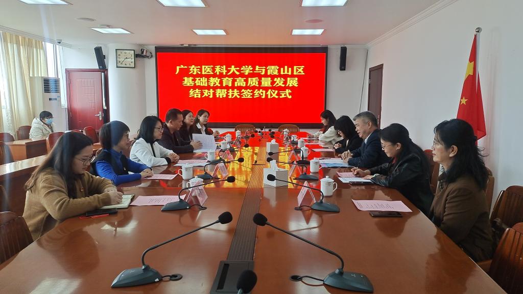 学校党委副书记罗辉同志与霞山区教育局局长谢海培同志分别代表帮扶方与受援方签署了结对帮扶协议。霞山区副区长侯素娟、霞山区教师发展中心主任程喆、学校校长办公室主任杨丹、团委书记陈婷、教育技术中心与信息中心主任陈晓、人事处(教师发展中心)副处长岑伟强等相关人员参加了签约仪式,签约仪式由谢海培主持。