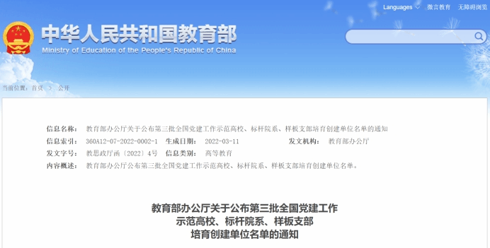 3月18日,教育部网站发布《教育部办公厅关于公布第三批全国党建工作示范高校、标杆院系、样板支部培育创建单位名单的通知》,附属第二医院呼吸与危重症医学中心党支部获批“全国党建工作样板支部”培育创建单位。
