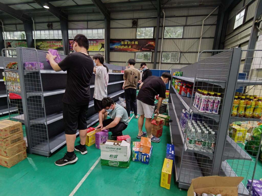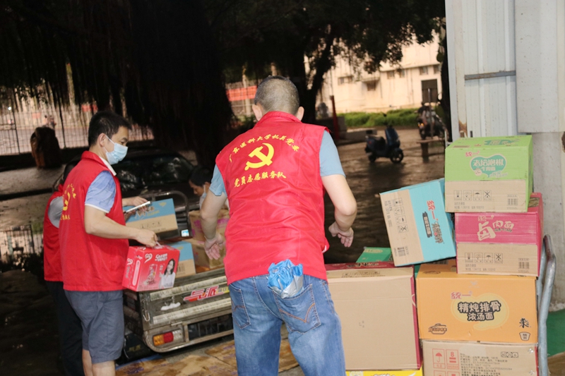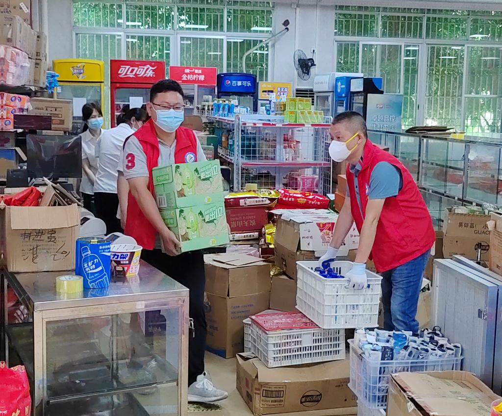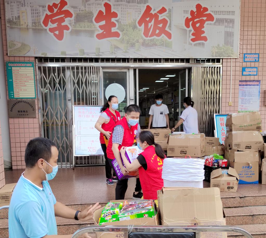 据悉,下午三点因小卖部人手不足,后勤保障党员突击队临时党支部、机关党委疫情防控志愿服务党员突击队临时党支部的党员志愿者和第一临床医学院2020级医学影像学专业的学生志愿者马上帮忙搬货,一箱箱物资从饭堂运送到体育馆。冒着雨,志愿者们肩挑手扛,一直搬到晚上八点多才去吃饭。