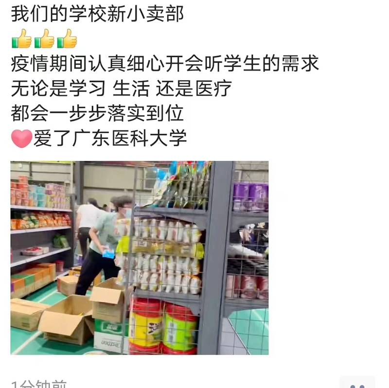 第一临床医学院2021级儿科学专业的庄钦豪同学说:“学校工作效率真是非常高。我们反馈意见后就马上行动。小卖部原来在饭堂的一个角落,商品种类和数量不多,封闭管理后买东西经常排长龙,搬到体育场场地变大,挑东西时候没那么拥挤,有利于防控工作,关键东西更多,我们有了更多的选择,一举三得。”