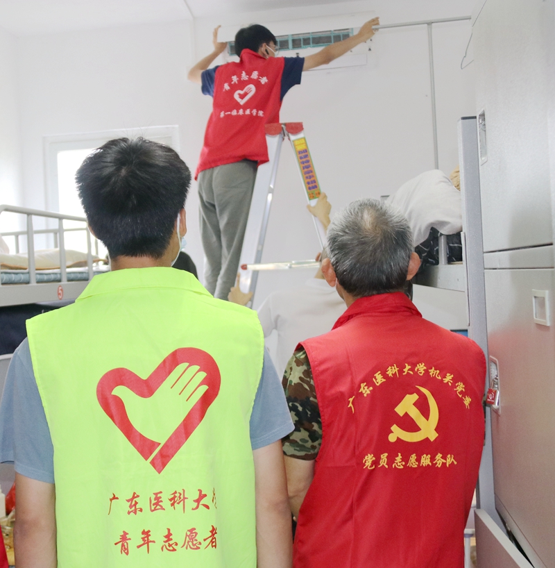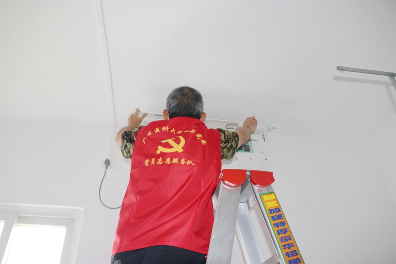 科研平台服务管理中心主任揭新明老师也没闲着,在学校资产与实验室管理处的大力支持下,他与学校青年志愿者协会和第一临床学院青年志愿者协会的12名同学一起,组建了空调维护维修志愿者服务队。仅在5月15日,这支师生志愿者服务队就对湛江校区校内学生宿舍的19台空调进行了维护维修,解决了空调制冷效果差、噪音大、漏水等问题。