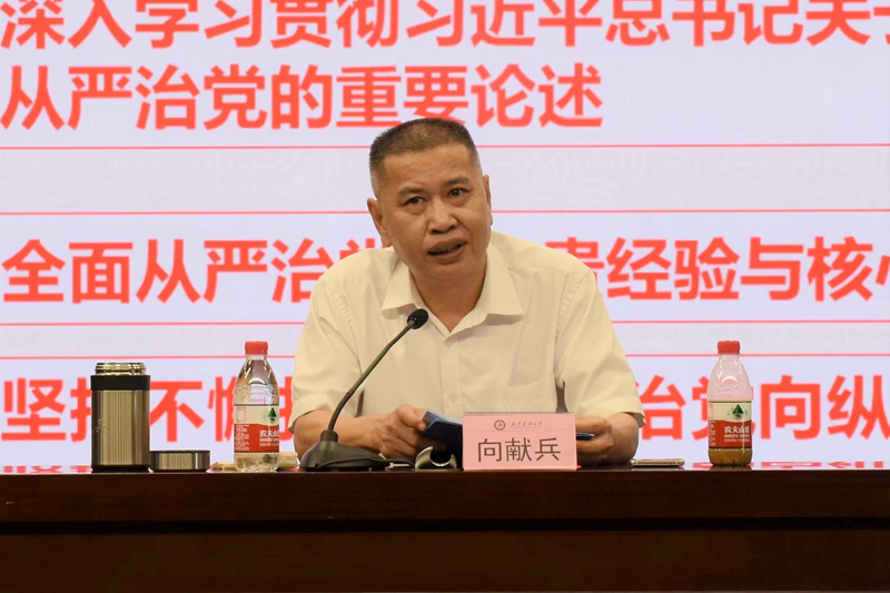 学校党委副书记、纪委书记,广东省监委驻新葡萄8883官网监察专员向献兵作了题为《坚持不懈把全面从严治党向纵深推进》的辅导讲座。报告内容从新时代全面从严治党成效卓著、深入学习贯彻习近平总书记关于全面从严治党的重要论述、全面从严治党的宝贵经验与核心要义、坚持不懈把全面从严治党向纵深推进等四个方面谈了学习体会。他强调,踏上新的赶考路,全面从严治党责任与使命,比过去要更加艰巨。我们要忠诚拥护“两个确立”,坚决做到“两个维护”,继续发扬历史主动精神,永葆自我革命精神,深入贯彻全面从严治党战略方针,以永远在路上的坚定执着,继续打好全面从严治党、党风廉政建设和反腐败斗争攻坚战持久战,推动全面从严治党乘势而上、再接再厉,以全面从严治党的新成效迎接党的二十大胜利召开。