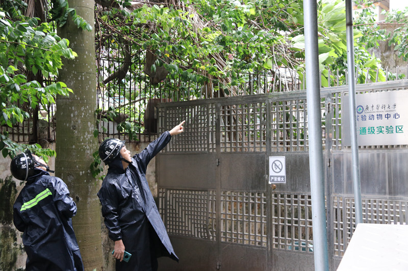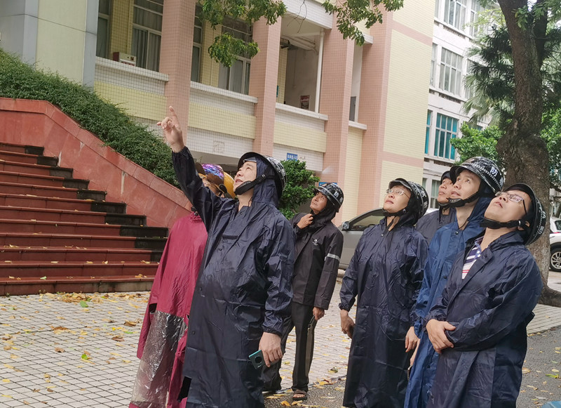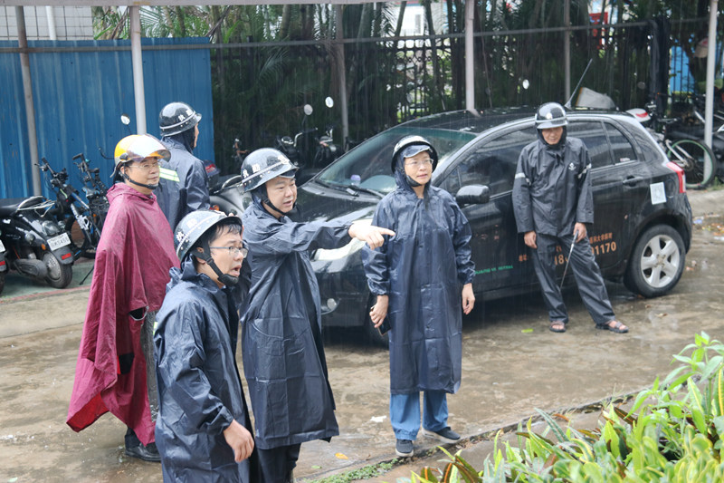 今年第3号台风“暹芭”来袭,2022年7月2日上午,风声呼啸,夹杂急雨,学校党委副书记罗辉带领相关部门人员趁台风未登陆前再次对湛江校区进行安全检查,重点排查楼宇门窗关闭情况、有无大风高空坠物隐患等。