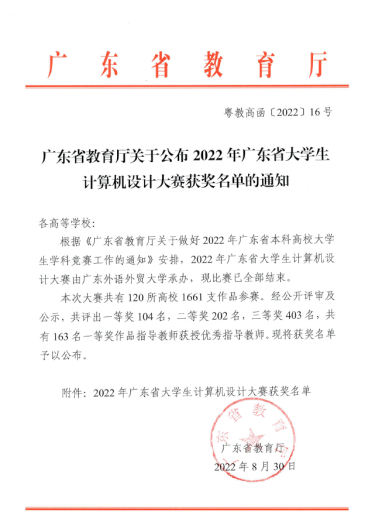 近日,由广东省教育厅主办,广东外语外贸大学承办的2022广东省大学生计算机设计大赛结果公布,新葡萄推荐作品获一等奖2项,二等奖1项,三等奖2项,获奖总数和一等奖数量均创历史新高。