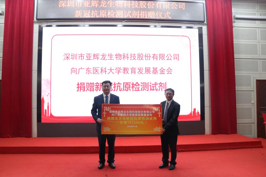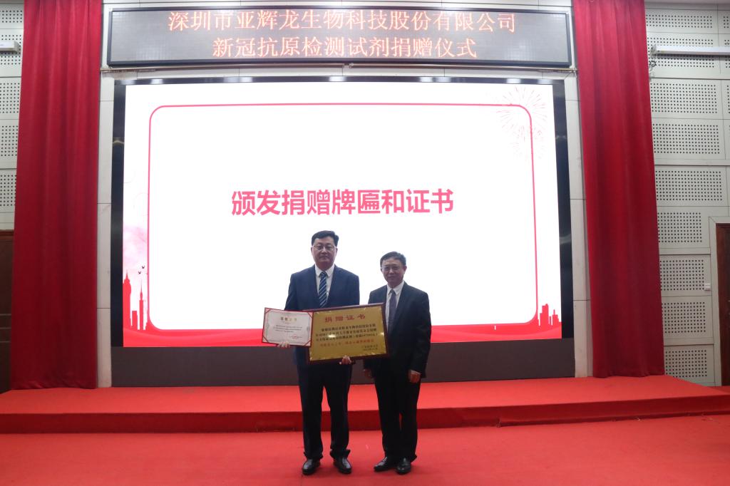 在捐赠仪式上,刘新光副校长代表新葡萄8883官网教育发展基金会接收深圳亚辉龙捐赠5万人份新冠抗原检测试剂盒,并为其颁发捐赠证书及捐赠牌匾。