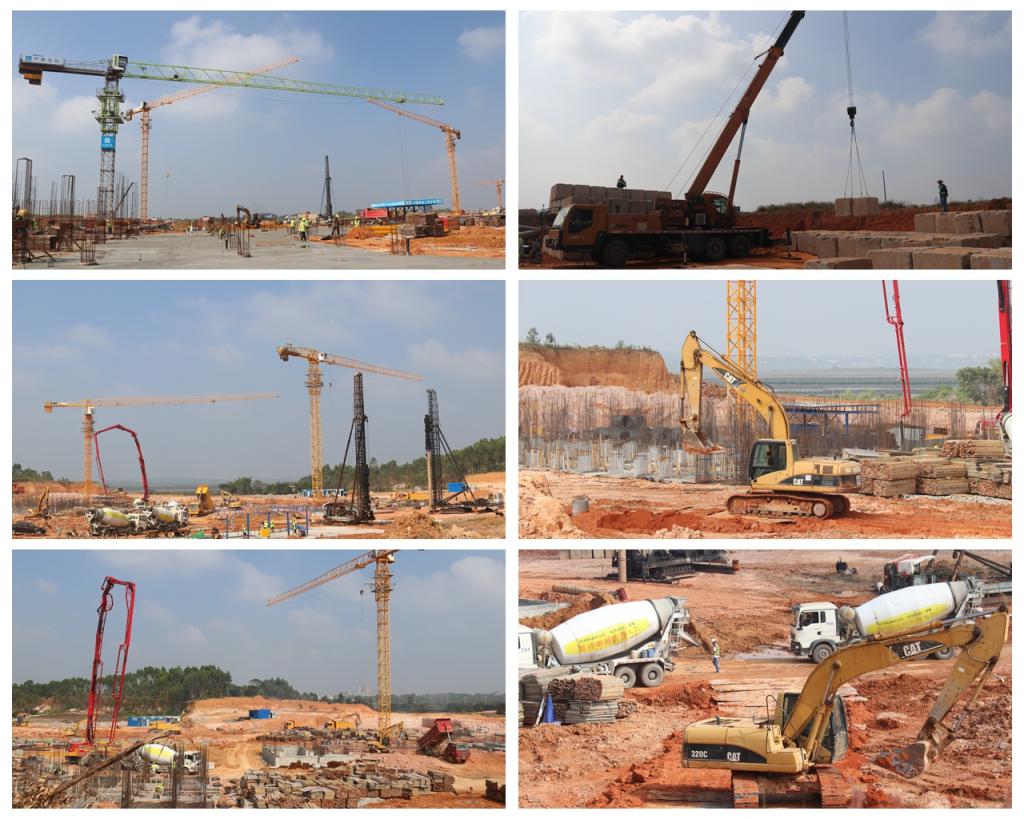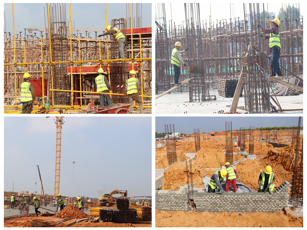 现场可见,数百名施工人员挥汗如雨,伴随着机器的轰鸣声,随处都有桩基施工、脚手架支模架搭设、承台地梁钢筋绑扎、承台预制板安装、场地内土方平衡、开挖承台地梁……紧张快干、热火朝天的建设热潮扑面而来。