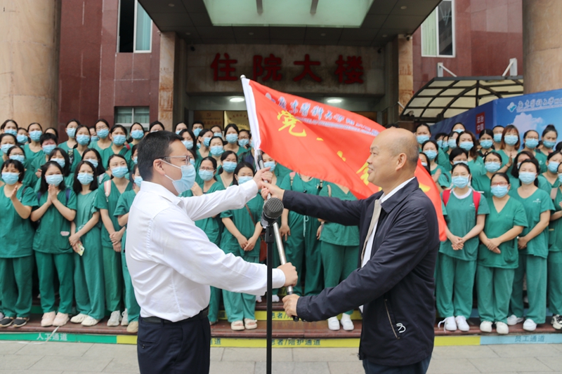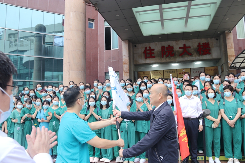 出发前,卢景辉向广东医附院支援广州市新冠肺炎医疗救治队总领队、医院党委副书记、纪委书记林挺葵书记,医疗救治队副领队孙小聪授旗。队员们有序集合上车,带着学校和医院领导的嘱托与期望,向“疫”而行,开启本次支援广州市新冠肺炎医疗救治工作的征程。