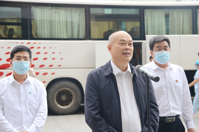 25日下午,附属医院党委书记李明意主持出征仪式,学校党委书记、校长卢景辉和医院全体领导班子成员为医疗队鼓劲壮行。卢景辉表示,当前疫情发展形势严峻复杂,希望队员们带着省委、省政府和学校、医院的信任和期待,不惧困难、逆行而上,扛起守护生命的职责使命。他要求,一要充分发扬“一方有难、八方支援”精神,弘扬伟大抗疫精神,以昂扬的斗志投身广州疫情防控工作,以医者仁心救治患者;二要充分展现学校和医院形象,作为广东省高水平医院和省级区域医疗中心的一员,要坚持为民服务的工作理念,以专业的医疗技术和服务高效完成医疗救治任务;三要凝心聚力,团结一致,夺取胜利。他还提醒大家在工作中注意自身防护,互相支持帮助,互相关心支持,劳逸结合,圆满完成工作任务,平安归来。