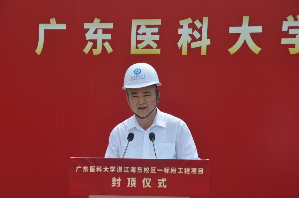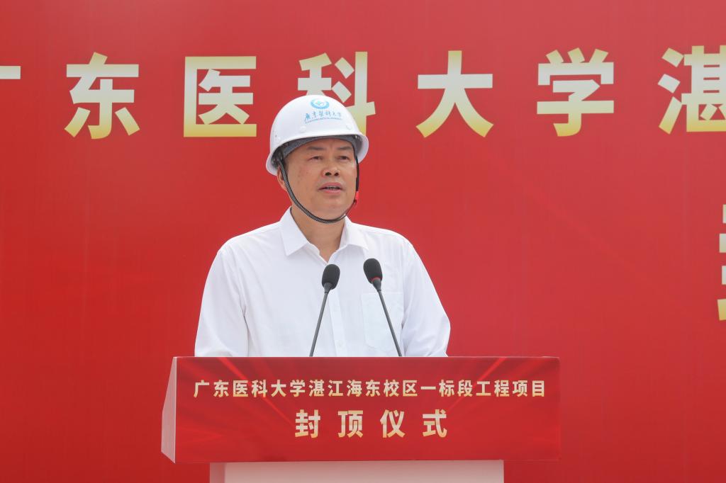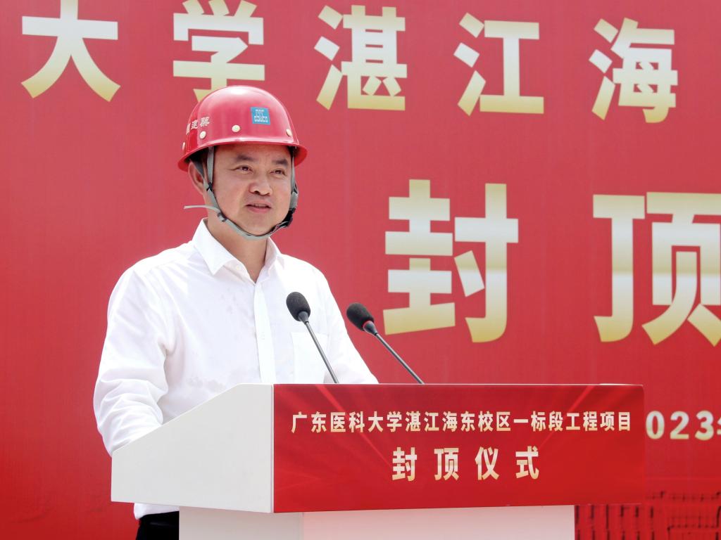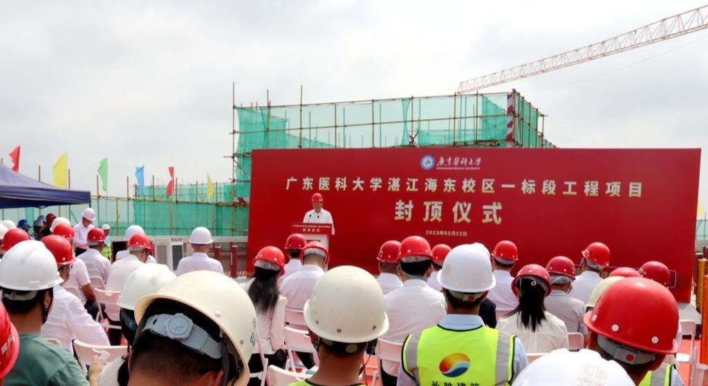 卢景辉代表学校向奋战在海东校区建设一线的建设者表示诚挚的感谢,向一直以来关心、支持学校发展建设的湛江市委、市政府和社会各界表示由衷的敬意,向一期一标段的顺利封顶表示热烈的祝贺。他表示,海东校区一标段工程顺利封顶,是献给学校65周年校庆的一份“厚礼”。学校将持续加强人才资源、平台服务、临床诊疗、成果创新等优势和力量,全力建强作为国家省级区域医疗中心的附属医院,全力建好作为湛江应急医院的附属第二医院。他强调,站在新的历史起点,新葡萄8883官网将深入学习贯彻党的二十大精神和习近平总书记视察广东重要讲话重要指示精神。加快构建新发展格局,坚定“以社会服务为己任”的办学理念,坚定不移以特色发展、创新发展、内涵式高质量发展,持续推进学校实现更高质量发展,全力服务湛江全力建设省域副中心城市、加快打造现代化沿海经济带重要发展极,在湛江跨越式高质量发展中贡献广东医的智慧和力量。