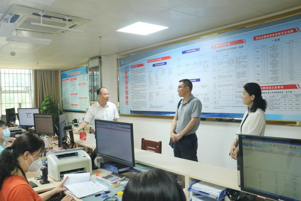 2023年6月1日,省委主题教育第二十一巡回指导组胡永明、梁越来到湛江校区财务处开展调研,他们了解到,财务处通过设立财务报账顾问、限时办结、加大宣传、简化流程、加快智慧财务建设等方式,进一步优化报账流程,提高报账效率。实现“数据多跑路,师生少跑腿”,让指导组眼前一亮。