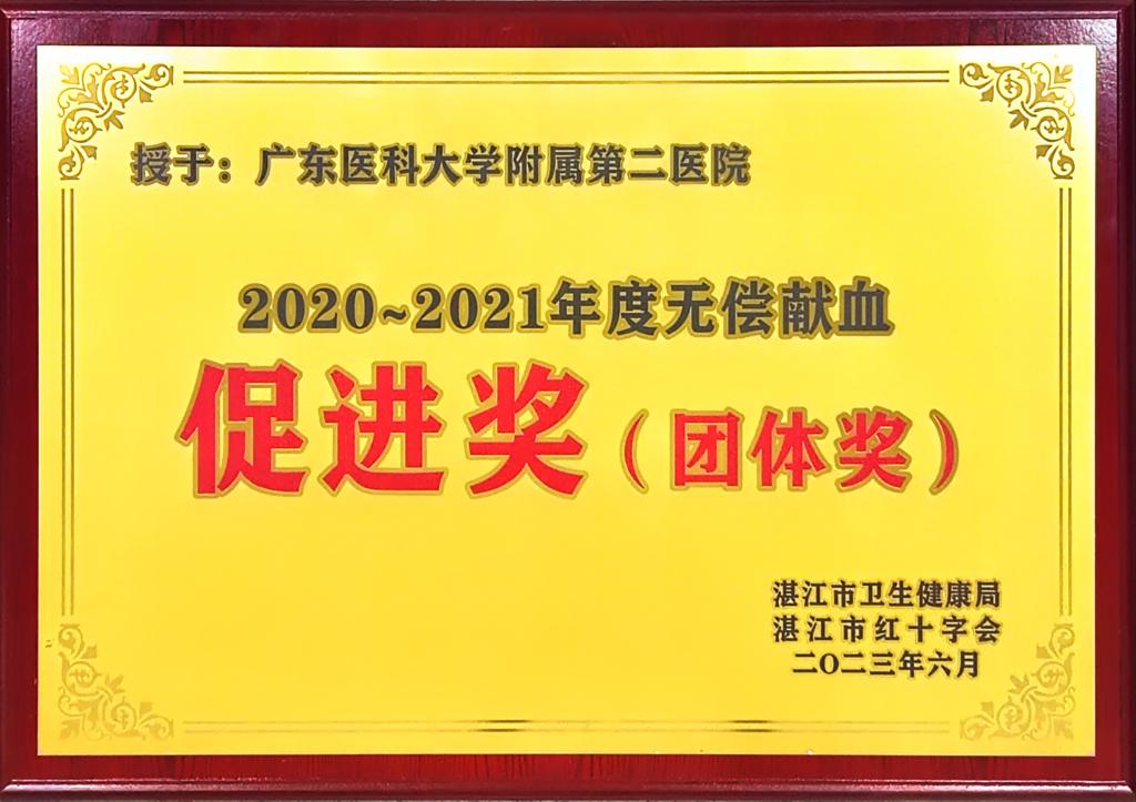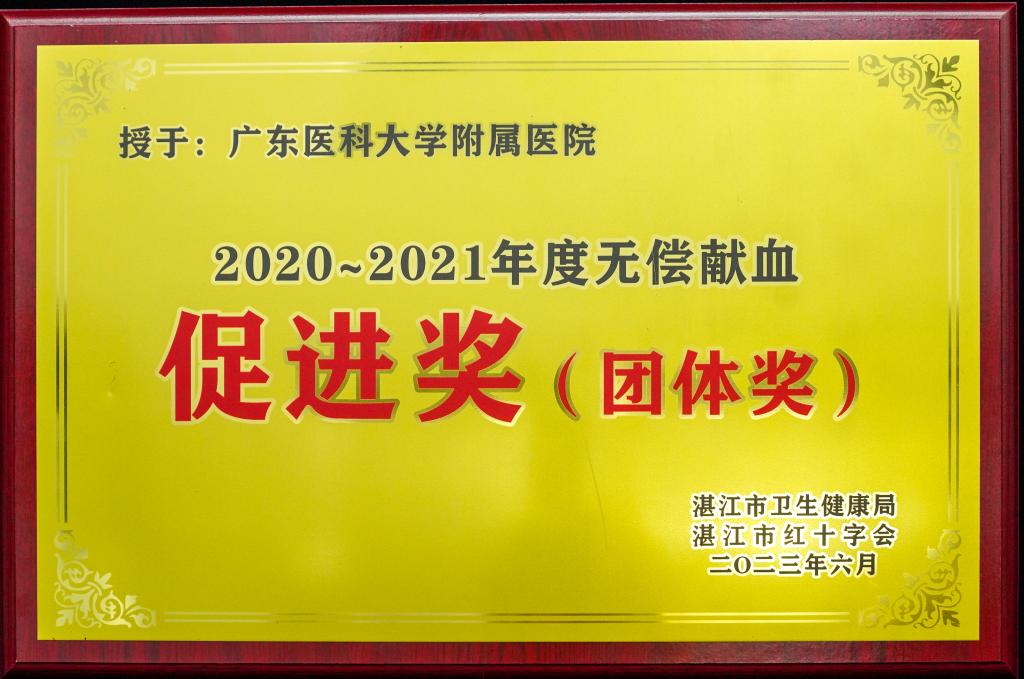 2023年6月9日湛江市政府在中心人民医院召开全市无偿献血工作会议。新葡萄8883官网、新葡萄8883官网附属医院、新葡萄8883官网附属第二医院都获得了2020-2021年度 “湛江市无偿献血促进奖”荣誉称号。
