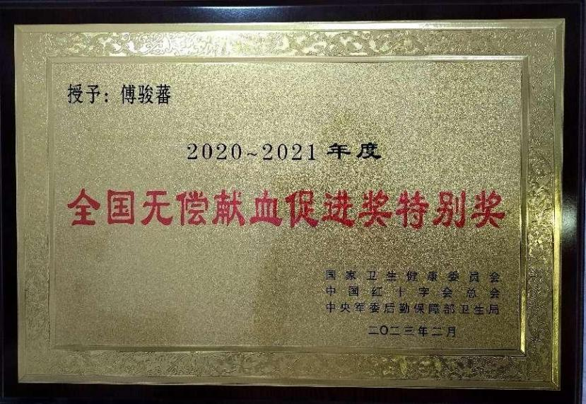 新葡萄医院管理处傅骏蕃同志荣获“2020-2021年度全国无偿献血促进奖特别奖”。据悉,广东省获此奖项的集体(或人员)只有5个,傅骏蕃同志为东莞市唯一获此殊荣人员。