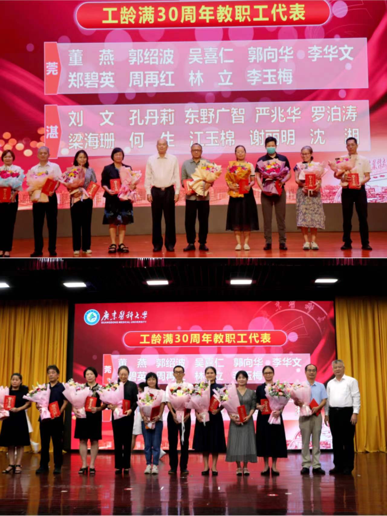 学校党委书记校长卢景辉,党委副书记罗辉分别为工龄满30周年教职工代表颁奖。