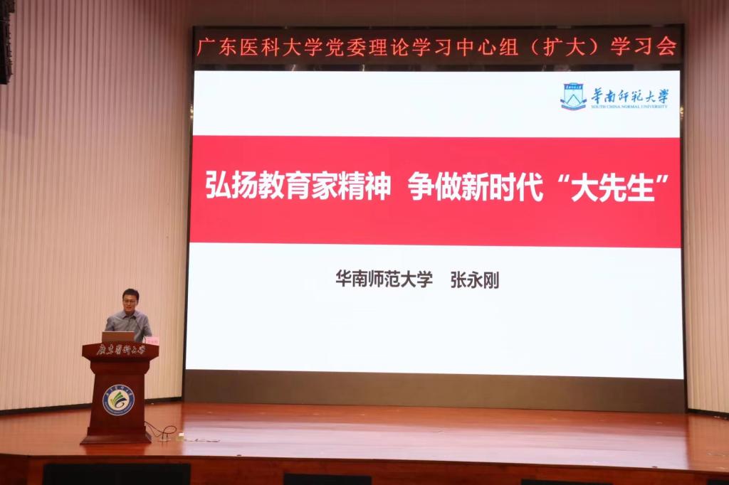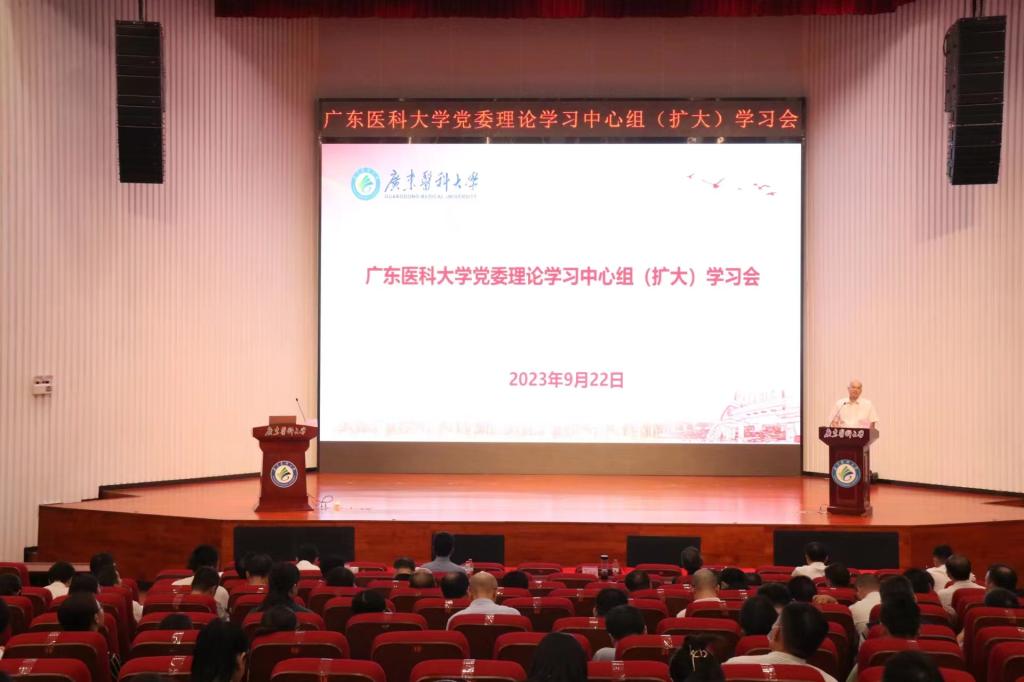 2023年9月22日上午,新葡萄8883官网召开党委理论学习中心组(扩大)学习会,邀请了2023年高校网络教育名师、华南师范大学马克思主义学院张永刚教授作专题辅导报告。学校党委书记、校长卢景辉主持并领学了习近平总书记致信全国优秀教师代表精神。学习会在东莞校区图书馆报告厅和湛江校区新教学楼九楼报告厅同步举行。学校党委理论学习中心组成员,帮扶团队队长,中层干部,思政课教师,辅导员,各基层教学组织负责人参会。