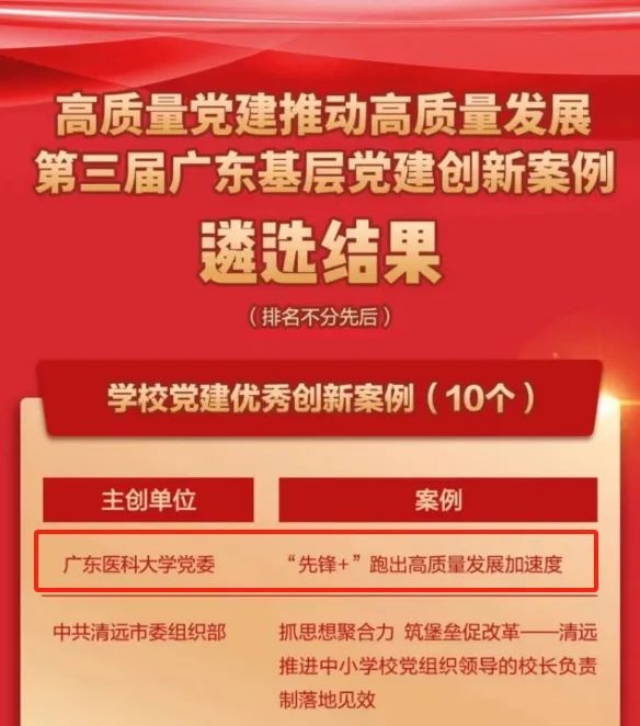 2023年10月13日,第三届广东基层党建创新案例遴选结果公布,学校党委《“先锋+”跑出高质量发展加速度》案例荣获广东学校党建优秀创新案例(全省10个)。