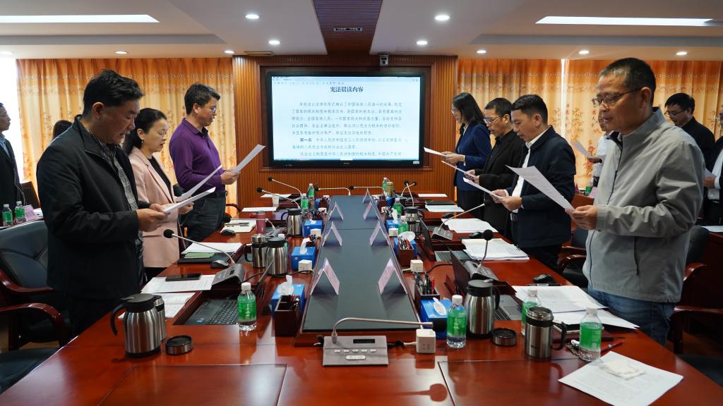 “第一条 中华人民共和国是工人阶级领导的、以工农联盟为基础的人民民主专政的社会主义国家……”与会人员在诵读中重温宪法条款,感受宪法的神圣和庄严。