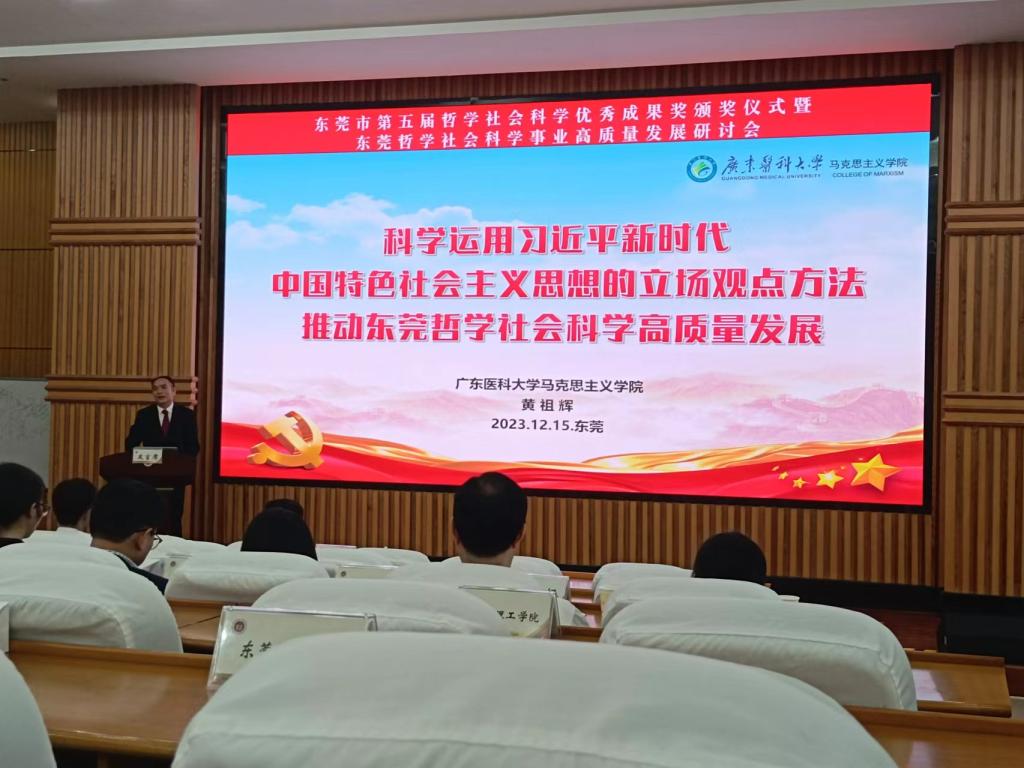 12月15日,东莞市第五届哲学社会科学优秀成果奖颁奖仪式暨东莞哲学社会科学事业高质量发展研讨会在东莞市委党校举行。会议回顾30年来东莞哲学社会科学事业的发展历程,表彰优秀社科人才,并对东莞哲学社会科学事业高质量发展进行了研讨。东莞市社科界专家学者、老中青社科工作者代表、社科联历届领导参加了会议。新葡萄马克思主义学院院长黄祖辉以及东莞理工学院、广东科技学院、市社科院等四位专家受邀在大会上作了主旨演讲。