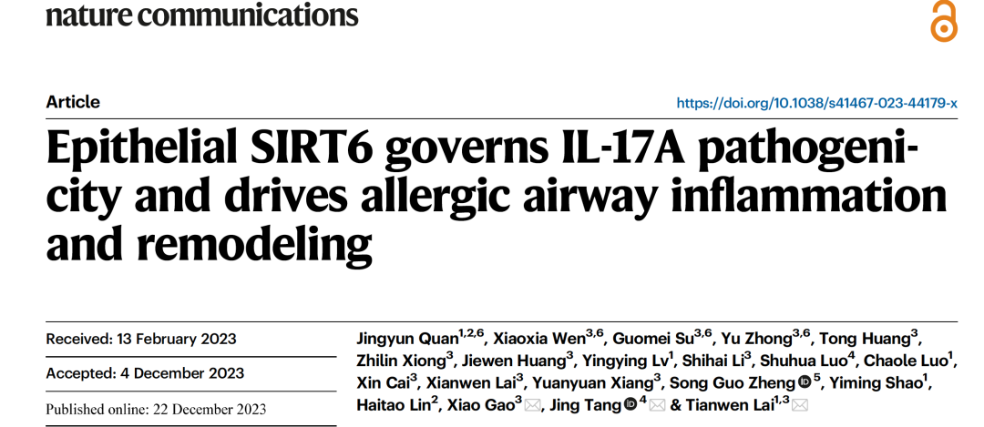 近日,新葡萄8883官网附属东莞第一医院/第二临床医学院教授、东莞呼吸医学研究所所长赖天文团队在国际顶级学术期刊Nature子刊Nature Communications发表题为“Epithelial SIRT6 governs IL-17A pathogenicity and drives allergic airway inflammation and remodeling”(气道上皮SIRT6调控IL-17A致病性导致哮喘气道炎症及重构)的重要研究成果。这是新葡萄师生首次以新葡萄8883官网为独立完成单位在Nature子刊发表重要成果。