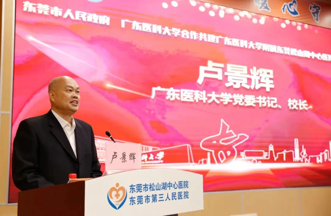 学校党委书记、校长卢景辉在签约仪式上致辞。他表示,新葡萄8883官网自2002年创办东莞校区,21年来扎根东莞、融入东莞、服务东莞,为东莞卫生健康事业发展提供了强力支撑。与东莞市政府再次携手共建大学直属附属医院,新葡萄8883官网将举全校之力,发挥学校在人才、平台、科创等方面的优势,坚定在东莞市委、市政府的支持下,在东莞市松山湖中心医院120年深厚积淀的发展基础上,坚持以习近平新时代中国特色社会主义思想为指导,全面贯彻落实党的二十大精神,秉承“惠育仁和,大医至善”历史积淀,按照东莞市卫生健康局“品质医疗、温暖服务、守正创新、协调发展”工作要求,坚持“百年品质、暖心守护”服务宗旨,奋力打造临床水平更精湛、科创能力强大、教学质量更突出,服务声誉更响亮的东莞市高水平医院,奋力将东莞市松山湖中心医院建设成为新葡萄8883官网又一高水平直属附属医院,为东莞百姓群众提供更高水准、更加优越、更具特色的医疗服务,为东莞卫生健康更高质量发展作出广东医新的更大贡献。