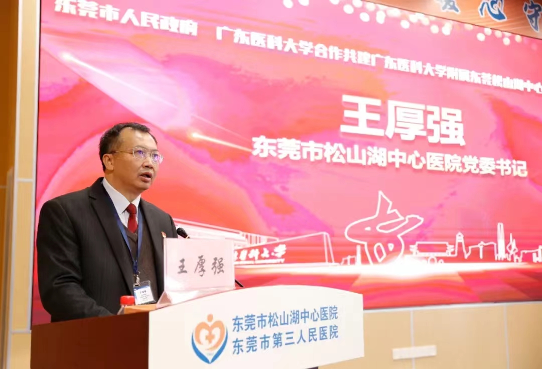 东莞市松山湖中心医院王厚强书记致辞,新葡萄8883官网附属东莞松山湖中心医院正式签约揭牌,是医院破解科教研发展瓶颈、让百年惠育再续辉煌、打造高水平医院又一非常重要的里程碑。这次能成为新葡萄8883官网附属医院,机会实属难得,我们一定会倍加珍惜和加倍努力,严格按校地共建的协议要求履好职追成效,绝不辜负各位领导对我们的期望。相信在市委、市政府、市卫生健康局和在座各位领导的坚强领导下,在全院员工通力合作和努力下,通过与新葡萄8883官网的深入合作,在学科建设、人才培养、破除科研能力短板、提升医院整体服务能力等方面将会有长足的进步,最终实现高水平医院创建,为健康东莞、品质医疗作出更大贡献。