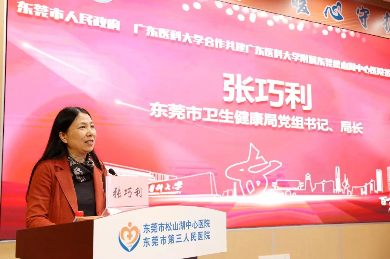 东莞市卫生健康局张巧利局长致辞时表示,新葡萄8883官网是著名的高等学府,是广东省高水平大学建设计划重点学科建设高校,在医科方面有着非常突出的资源和优势。东莞地处大湾区核心地带,GDP超万亿、常住人口过千万,是全国第15个“双万”城市,随着人口数量的增长和生活质量的提升,人民群众对高品质医疗卫生服务的需求也越来越高。此次,我们与新葡萄8883官网在前期合作共建新葡萄8883官网附属东莞第一医院的基础上,再次联手合作共建新葡萄8883官网附属东莞松山湖中心医院,是“亲上加亲”的一件大喜事,不仅有利于加快提升市松山湖中心医院的技术质量、科研水平和综合实力,还有利于推动整个松山湖片区乃至东莞市的医疗服务水平再上一个台阶,是东莞医疗事业的里程碑大事,是东莞人民的大福祉。
