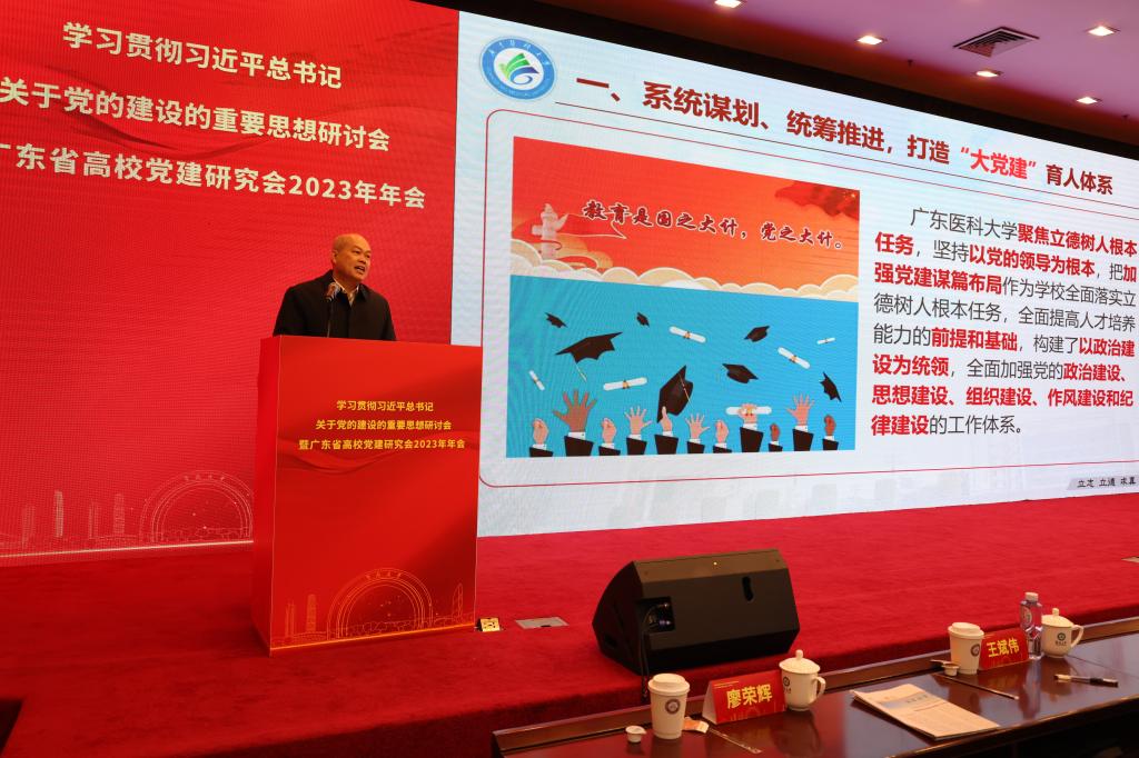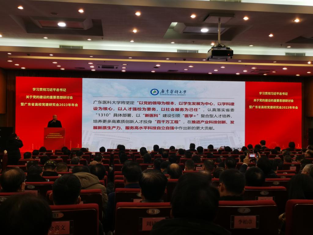 3月2日上午,学习贯彻习近平总书记关于党的建设的重要思想研讨会暨广东省高校党建研究会2023年年会在暨南大学召开。会议深入学习贯彻习近平总书记关于党的建设的重要思想,研究部署推进全省高校党的建设工作。中央组织部党建研究所副所长、全国党建研究会副秘书长张鹏,广东省委教育工委委员、省教育厅党组成员、副厅长邵允振,及广东省党建研究会有关同志,全省本科院校、高职高专和民办及合作办学院校160家会员单位党委书记、组织部部长及获奖代表近350人参加会议。学校党委书记、校长卢景辉和党委常委、组织统战部部长谭平出席会议。