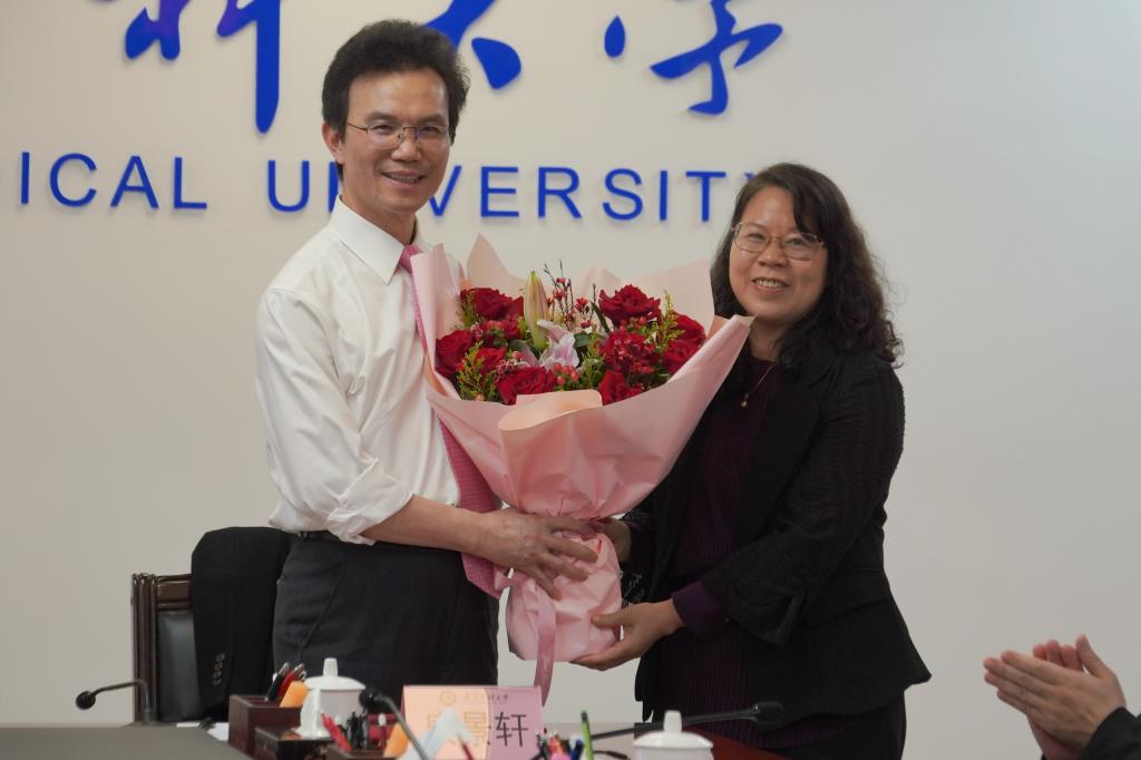校友会主任邓丽琼为康景轩校友送上鲜花