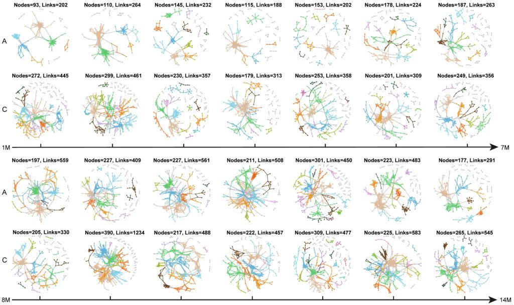 为此,该团队进行了一项长达14个月的纵向研究,以监测8周龄的C57BL/6小鼠在生命早期短期(8天)口服头孢曲松抗生素后肠道微生物多样性、微生物网络和粪便微生物代谢的动态变化。研究发现:生命早期短期口服头孢曲松显著降低了C57BL/6小鼠最初几个月肠道的微生物多样性、著降低了肠道菌群的网络的复杂性和稳定性、显著影响小鼠肠道菌群的代谢,如果观察结果适用于人类,可能会导致代谢性疾病的发生。虽然停用抗生素后,随着时间的推移,肠道菌群多样性和分子生态网络呈恢复趋势,但具有波动性,在整个实验期结束点(第14个月)仍未完全恢复到对照组水平,提示抗生素对肠道菌群多样性和分子生态网络的负面影响是持久的。因此,如果在小鼠中观察到的结果适用于人类,那么应该高度关注儿童短期接触抗生素可能带来的影响。