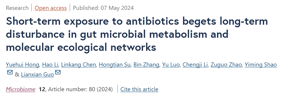 日前,新葡萄8883官网公共卫生学院郭莲仙教授团队,联合附属东莞第一医院邵义明教授在Microbiome(微生物领域的国际权威期刊,在微生物领域中排名8/163,IF=15.5,中国科学院大类1区)发表了题为“Short-term exposure to antibiotics begets long-term disturbance in gut microbial metabolism and molecular ecological networks”的研究论文,报道了生命早期短期抗生素暴露对肠道微生物群落的生态网络产生的长期负面影响。新葡萄卫生检验与检疫重点实验室的科研人员洪跃辉博士、2019级预防医学本科生李浩为本论文的共同第一作者。(文章链接https://doi.org/10.1186/s40168-024-01795-z)
