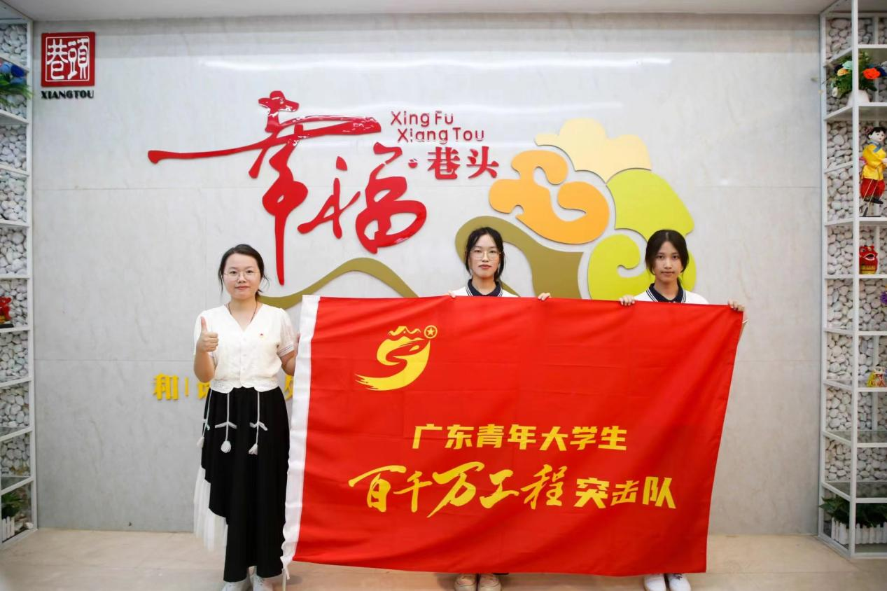 仪式现场,大朗镇团委为新葡萄大学生“百千万工程”突击队“沐阳伴学心理陪伴志愿服务队”授旗。