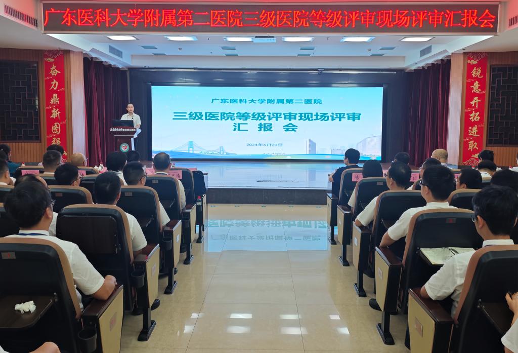 2024年6月28日至7月1日,广东医附二院迎来广东省卫生健康委等级医院评审专家组为期四天的三级医院等级评审现场评审。29日上午,顺利召开医院三级医院等级评审现场评审汇报会。湛江市人民政府副市长何嘉旻,新葡萄8883官网党委常委、副校长曾志嵘出席会议并作讲话,广东省三级医院等级现场评审专家组,湛江市卫生健康局党组书记、局长林兵,医院党政领导班子、全体中层干部、片区护士长、党支部书记及高层次人才等参加汇报会。