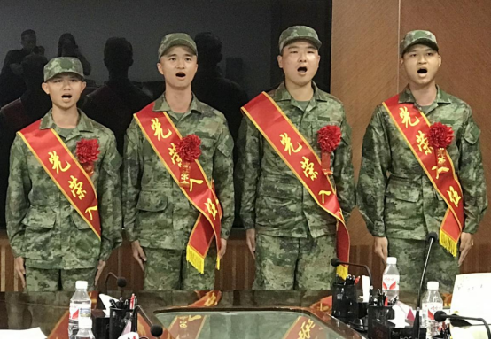 四位入伍大学生现场演唱《强军战歌》,向老师和家长汇报役前教育成果,表达对母校的感激之情及深情祝福。