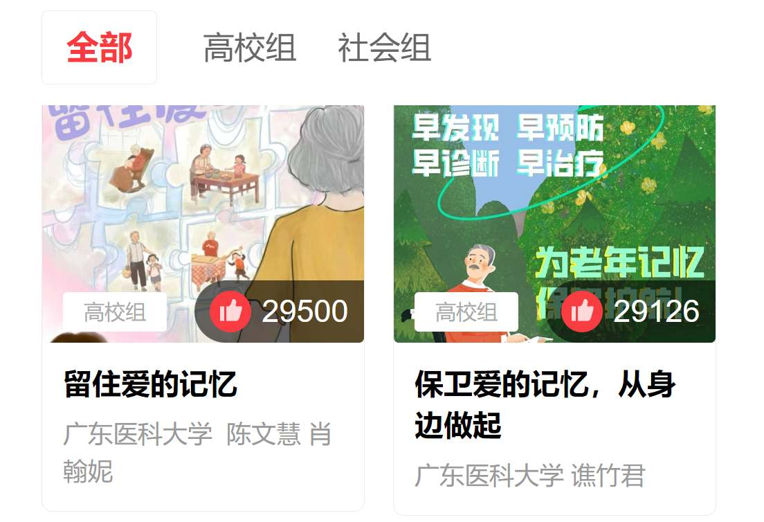 大赛在东莞市高校师生和社会创作团体、个人中掀起了老年痴呆防治科普宣传的热潮,收到作品465件,评选出一批有干货、有温度、有创意的老年痴呆防治宣传视频、海报和标语作品,通过活动作品的线上展播等,也让老年痴呆防治知识得到了更为广泛的传播与普及。
