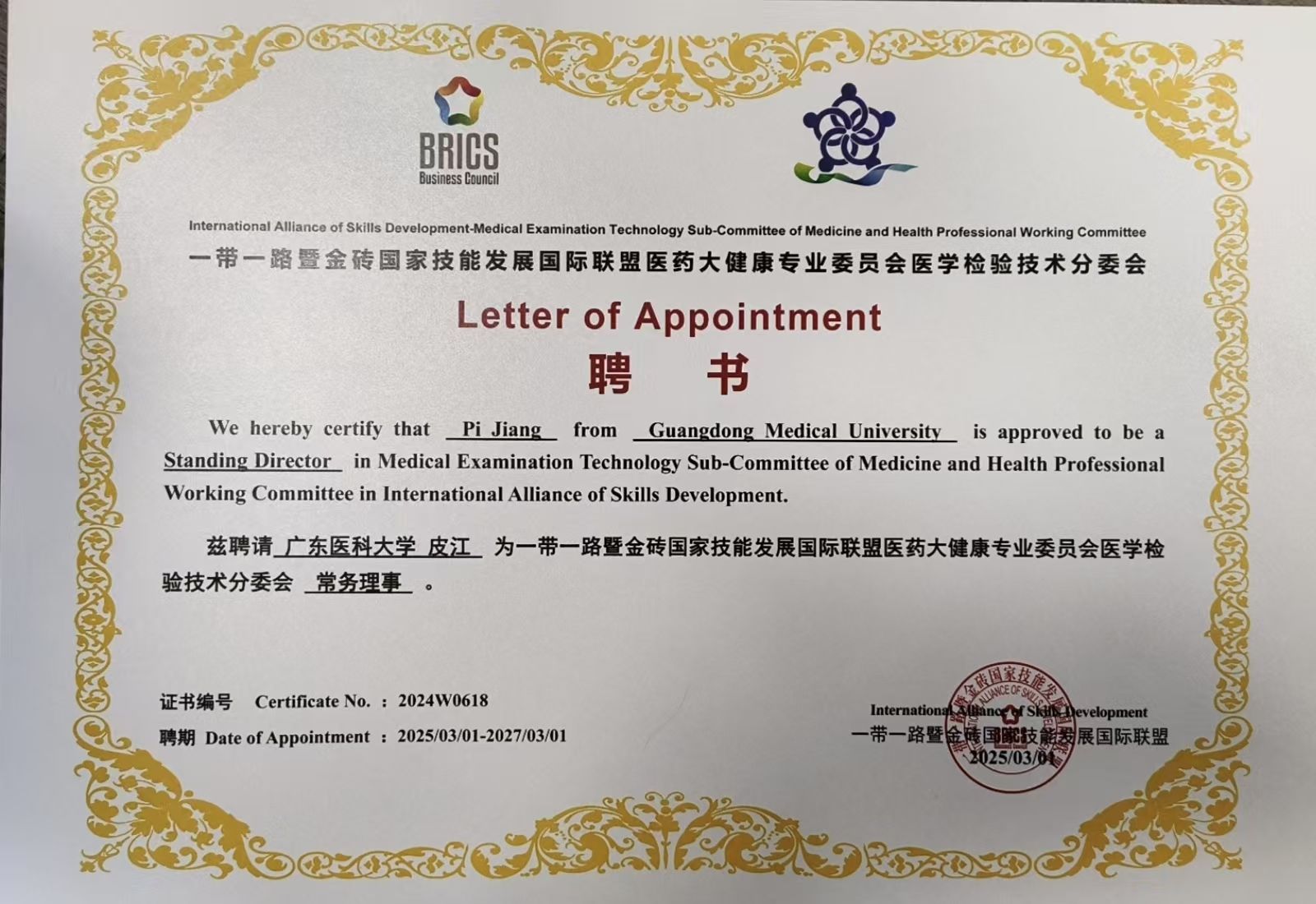 此外,在本次医学检验技术分委会年度会议中,本校老师得到同行较高的认可并取得了重要荣誉。本届增补委员中皮江副院长被聘为“一带一路”暨金砖国家技能发展国际联盟医药大健康专业委员会医学检验技术分委会常务理事,学院谢朝阳、郑碧英、梁一3位主任被聘为该分委会理事。目前学院共5位老师担任此分委会的常务理事或理事,充分体现了学校在医学检验技术领域的学术影响力和重要地位,同时为学院教师队伍专业发展和学术交流搭建了更高的平台。