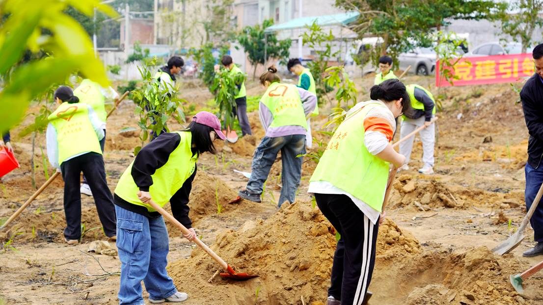 云霭轻笼,略带湿润的微风拂过植树现场,正是苗木扎根生长的绝佳时机。师生们挥锹培土的身影与温润的土地相映成趣,为乡村里增添盎然生机。