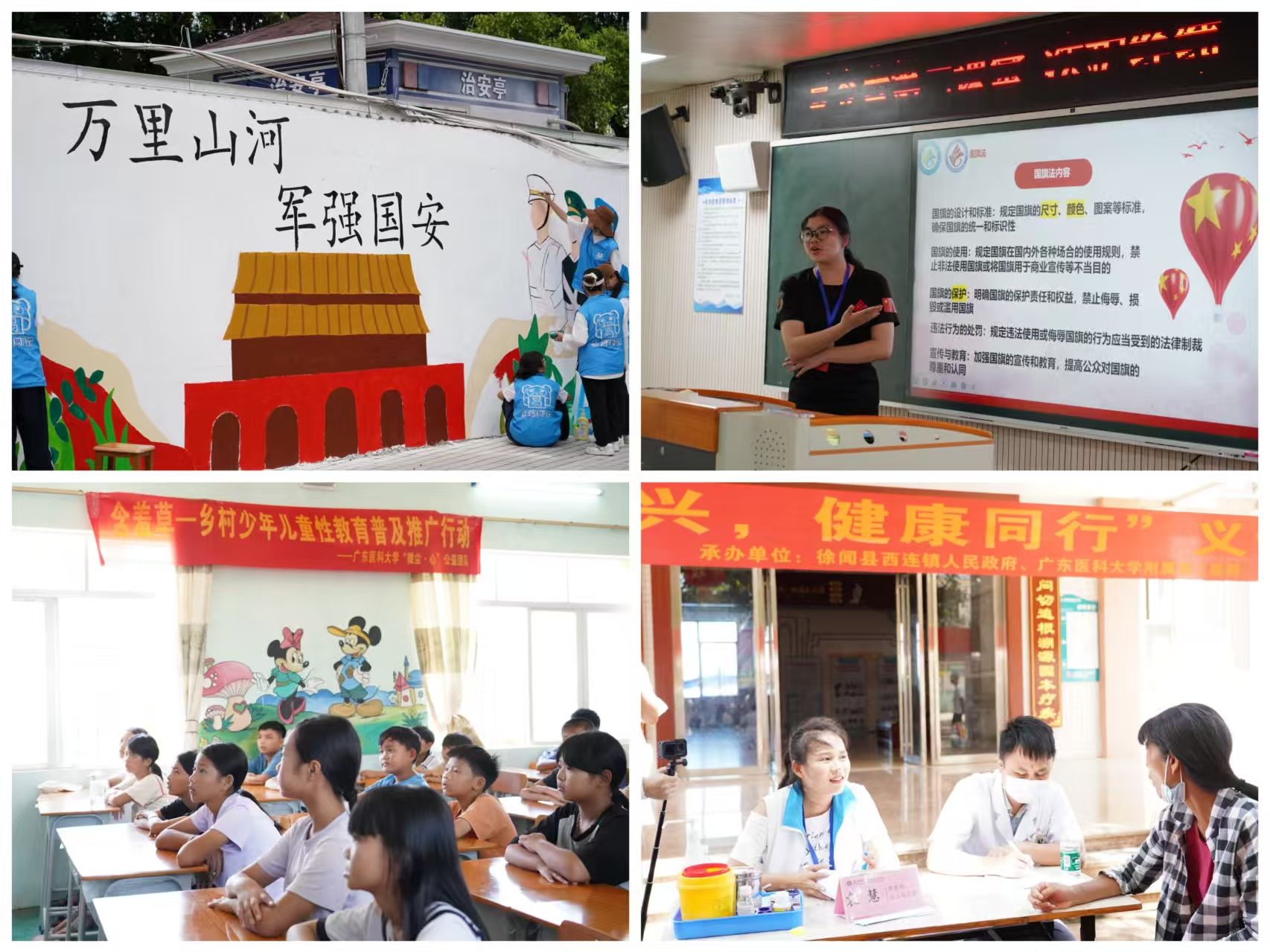 “三下乡”活动中,志愿者们立足当地特色,创作了系列饱含乡土情怀的墙绘作品。在绘制“长寿家风”和“敬老家风”主题墙绘时,志愿者们不仅用画笔传递孝道文化,更在与村民的交流中深化了对传统美德的理解。针对当地村民对戏曲艺术的热爱,志愿者特别创作了“穆桂英御敌图”。墙绘中巧妙融入了地方特色元素:连片的火龙果种植基地展现了农业产业新貌,跃动的足球图案则呼应了杨柑“足球特色小镇”的发展故事。青春筑梦实践团精心创作了以菠萝为主题的墙绘,生动展现了徐闻作为全国知名菠萝产地的独特魅力。在坡头,易班“医路阳光”志愿服务队的“万里山河 军强国安”的主题墙绘更是精准展现了当地的国防特色。志愿者们通过这一幅幅饱含深情的作品,真正实现了艺术创作与地方特色的完美结合,用画笔勾勒出乡村振兴的美丽画卷。